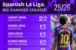 本季西甲创造机会数最多球员:亚马尔22次第一,费尔明&拉菲在列