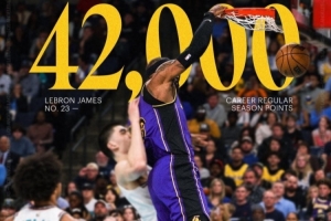 此役,湖人球星詹姆斯通过扣篮拿下生涯常规赛第42000分!