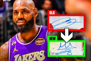 詹姆斯最新版本的签名中加入了他的皇冠标志。这款全新的詹姆斯签名将首次出现在即将发售的官方NBA球员卡上。