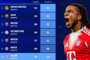 体育资讯4月11日讯 拜仁在欧冠客场2-1击败皇马,奥利塞送出助攻。《转会市场》统计显示他已经跻身新世纪五大联赛球员单赛季各项赛事助攻榜第7位。