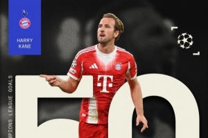 据媒体统计,凯恩成为欧冠历史第11位打进50球的球员,也是英格兰球员首人。